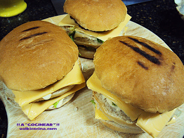 Hacemos dos cortes transversales a los panecillos, para que nos queden en tres partes... pasamos las hamburguesas por la plancha, y tostamos el pan.