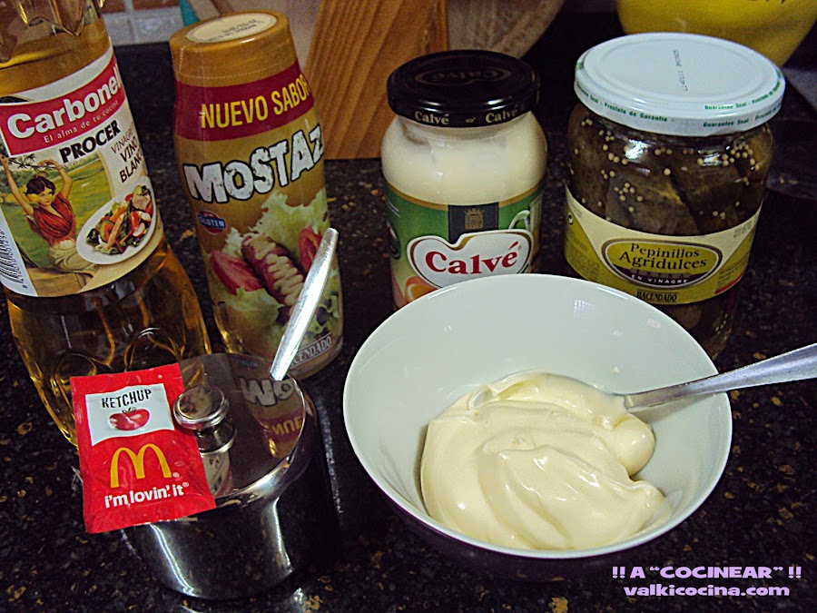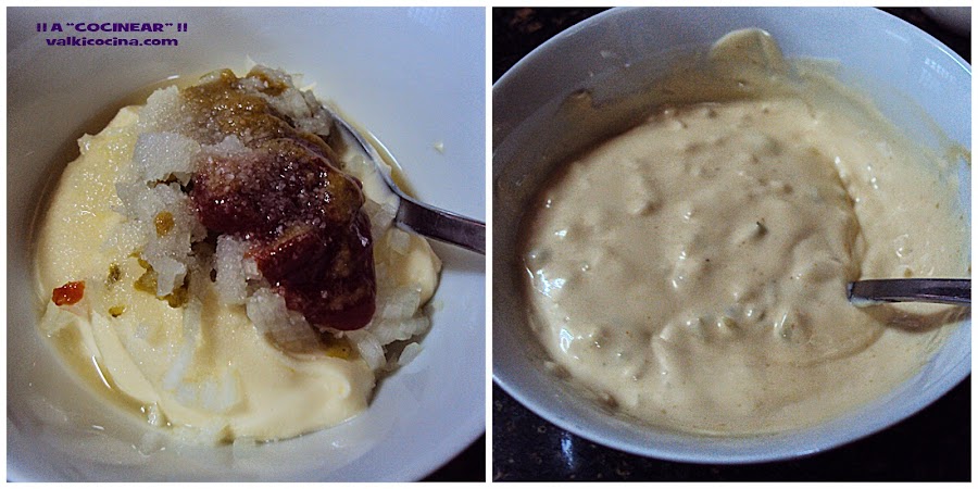 Para hacer la salsa, mezclamos en un cuenco: 4 cucharadas de mayonesa, un par de cucharadas de cebolla picada, 1 pepinillo previamente troceado y machacado en un mortero, 2 cucharaditas de azúcar, ... y 1 cucharadita de vinagre, otra de ketchup y otra de mostaza.