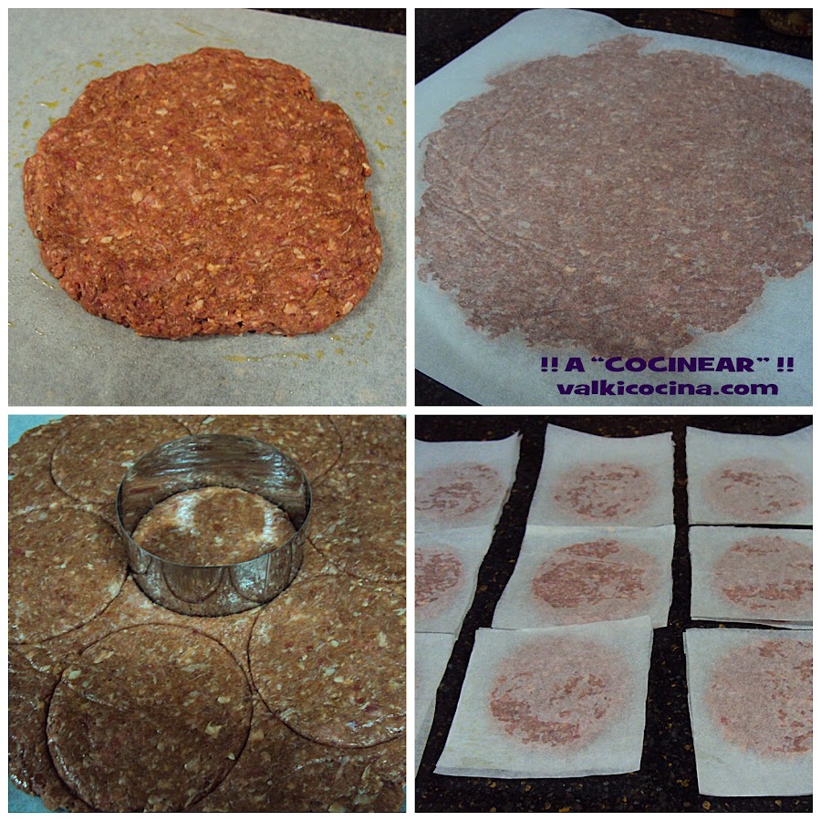 Retiramos el papel superior y con ayuda del aro cortamos las hamburguesas que deben ser 1 cm. más grandes de diámetro, que el que tenga el pan, ya que encogen mucho al cocinarse.