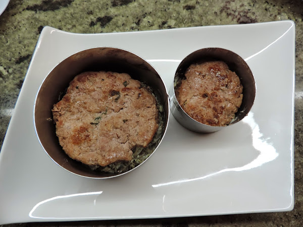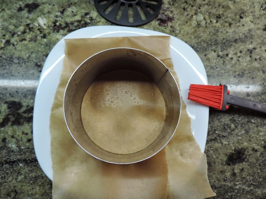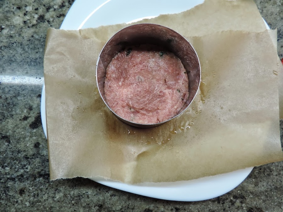 Ponemos un plato, encima papel de horno y un aro de emplatar del tamaño que queramos hacer las hamburguesas, con ayuda de una brocha untamos el papel y el aro con aceite de oliva.