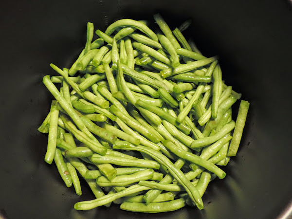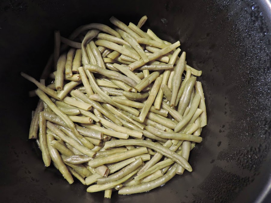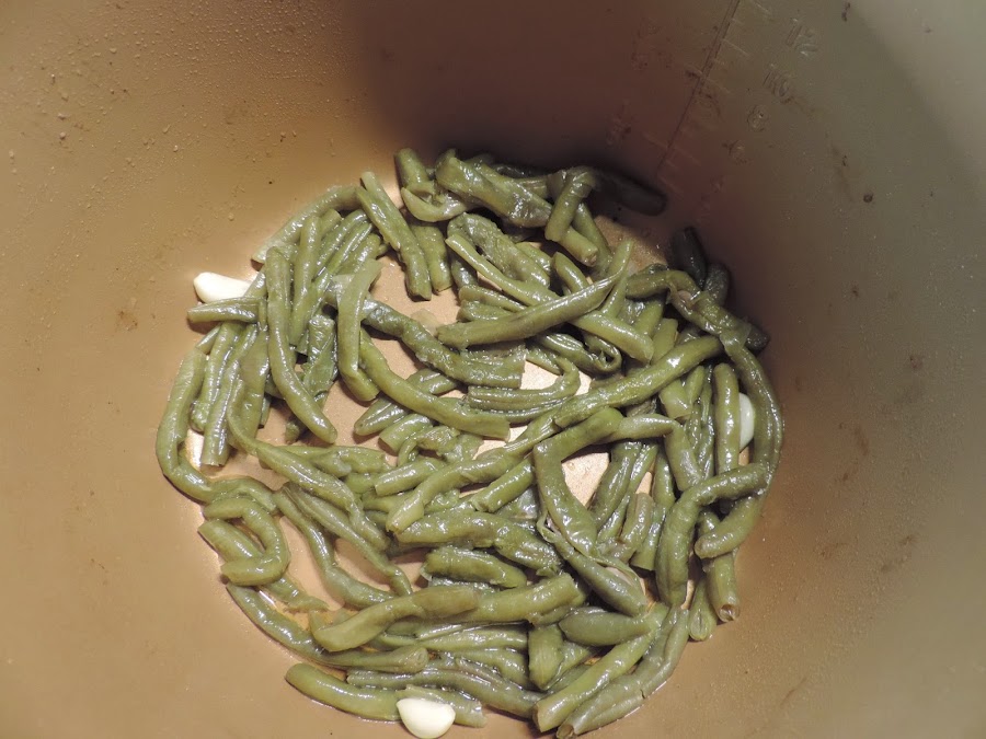 Ponemos la rejilla en la cubeta de la olla, el laurel, sal, el diente de ajo y echamos agua sin que llegue a cubrir la rejilla, echar las judías verdes.