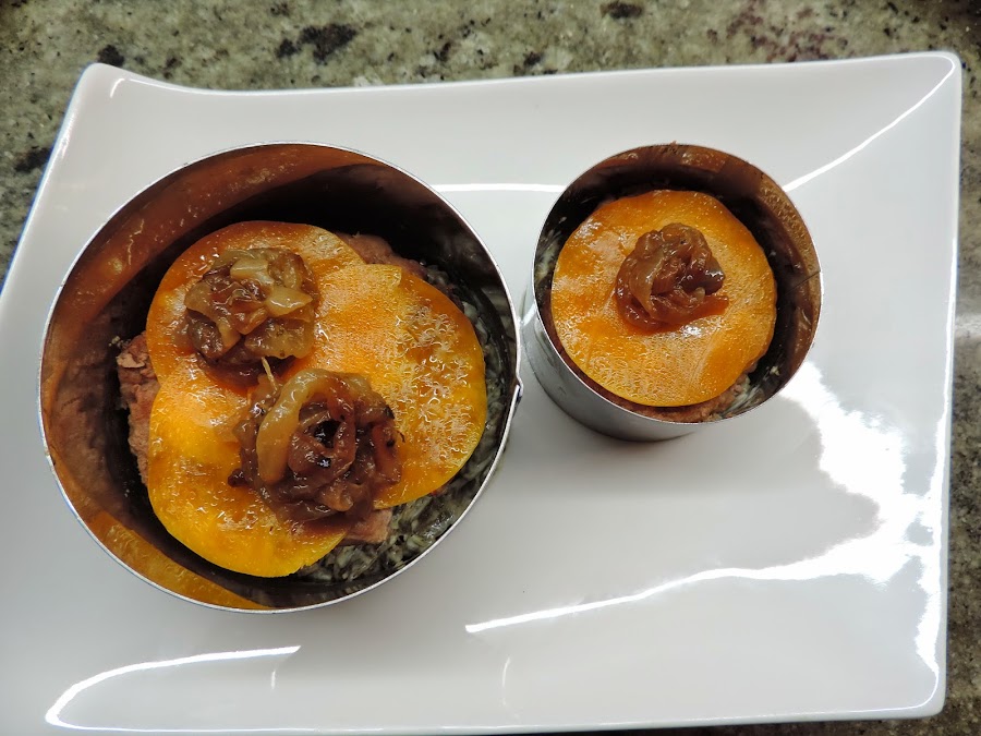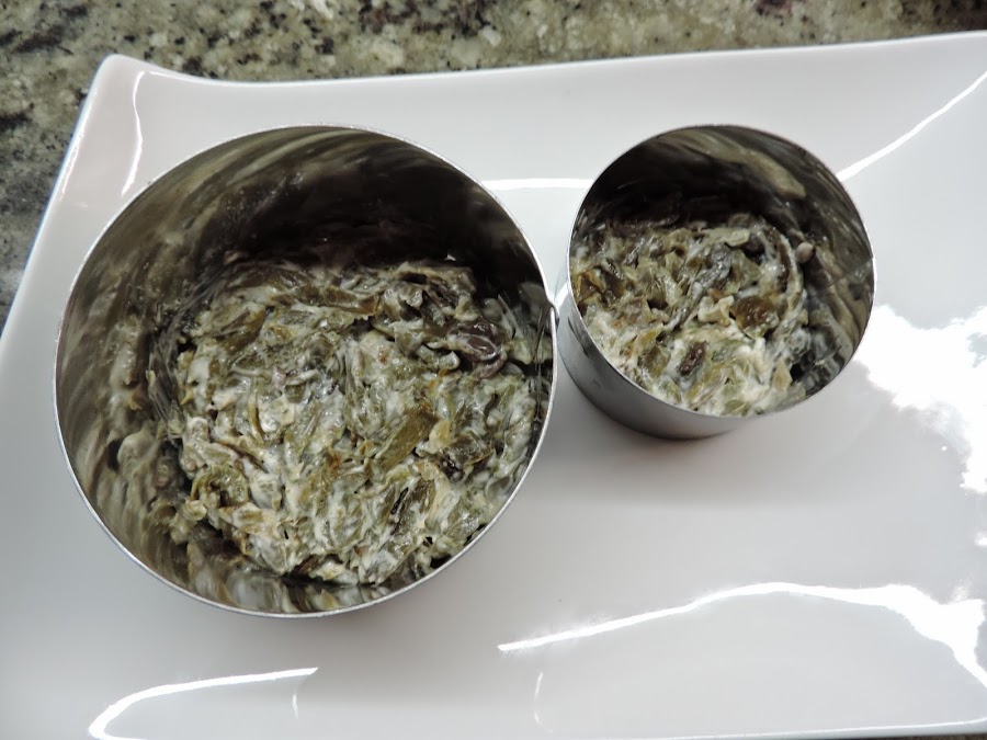 Con la ayuda del aro de emplatar ponemos en el fondo las judías verdes con la salsa de yogur a la finas hierbas.