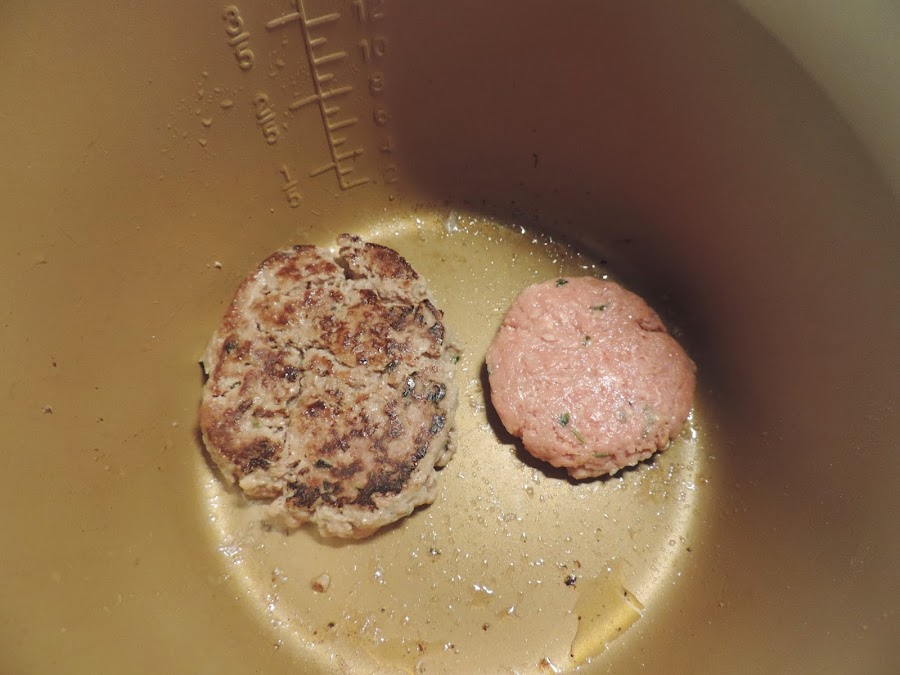 Ponemos unas gotas de aceite de oliva en la cubeta de la olla, ponemos las hamburguesas.