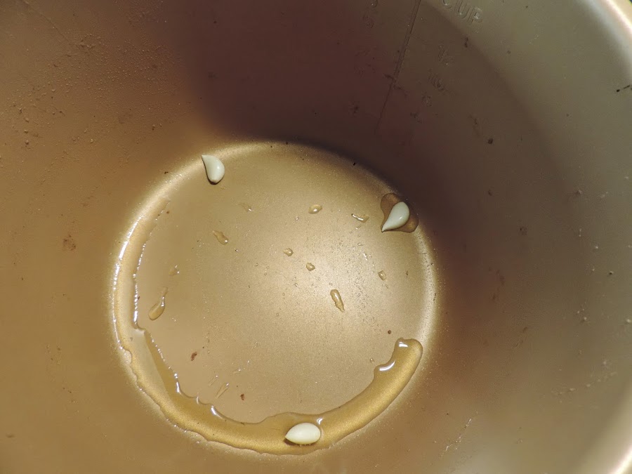 Ponemos unas gotas de aceite de oliva en la cubeta de la olla con los dientes de ajo.