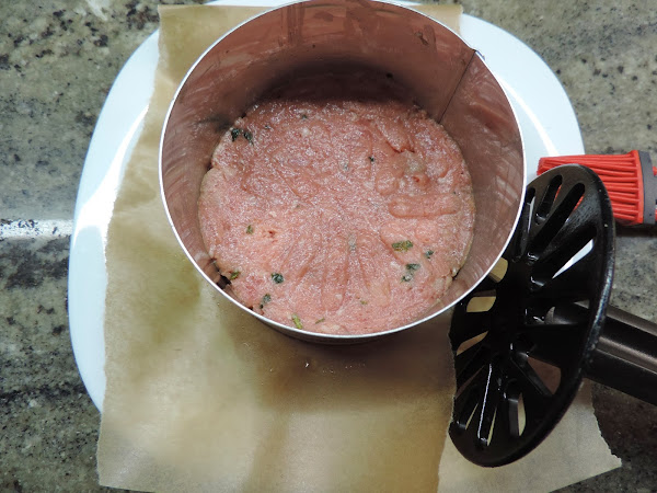 Ponemos un plato, encima papel de horno y un aro de emplatar del tamaño que queramos hacer las hamburguesas, con ayuda de una brocha untamos el papel y el aro con aceite de oliva.