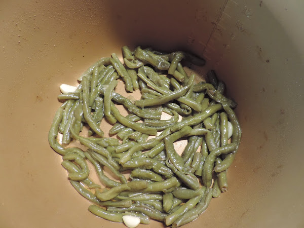Ponemos unas gotas de aceite de oliva en la cubeta de la olla con los dientes de ajo.