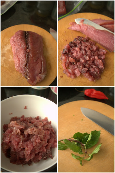 If you have a food processor, whiz tuna fillets, basil, mint, onions, ají pepper, and lemon juice. If not, follow my directions.