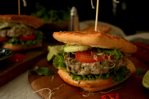 Abrimos los panes a la mitad. Ponemos la lechuga, limpia y seca, luego la hamburguesa, la rociamos con un poco de la salsa de hierbas que hemos hecho (para los niños ketchup), ponemos el tomate, limpio en rodajas, unas rodajas también de pepino y algunos brotes de alfalfa.