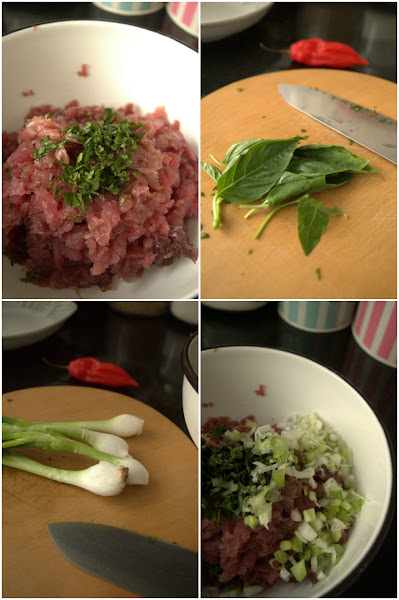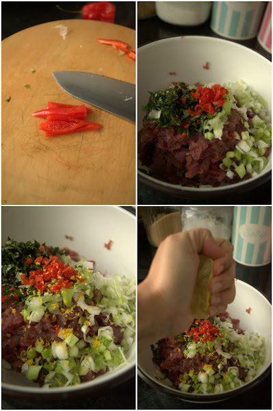 Si tienes una buena picadora, pon el atún, la albahaca, la menta, la cebolla, el cilantro y el zumo de limón y pícalo todo junto. Si no, sigue mis pasos.
