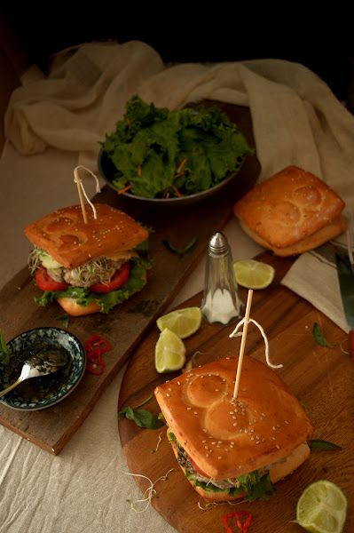 *I will show you the recipe, soon. Although you can use ciabatta or hamburger buns.