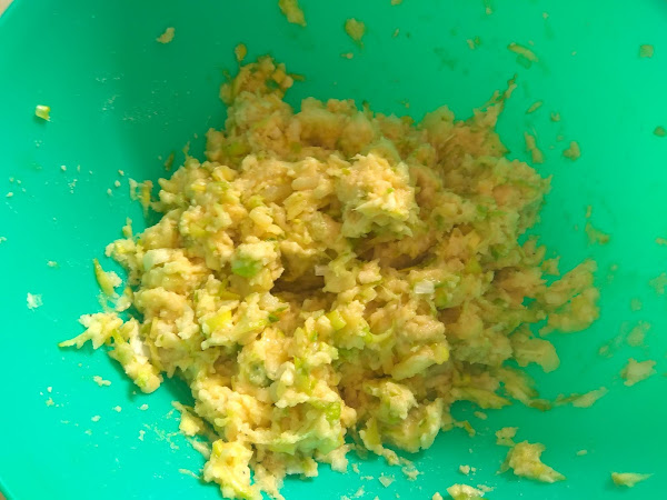 Pelamos el calabacín y lo rallamos, después escurrimos el agua del calabacín apretándolo con las manos limpias.