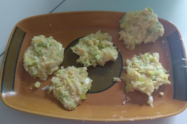 En un bol ponemos la patata y la machacamos, ósea la hacemos puré , añadimos las verduras picadas y el calabacín rallado, ponemos el queso rallado y 3 o 4 cuchara de pan rallado, salpimentamos y añadimos los dos huevos crudos, mezclamos todo muy bien hasta que quede homogéneo.