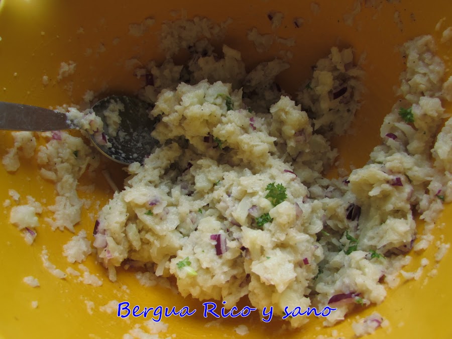3. Mezclamos la coliflor con el huevo batido, el parmesano rallado, la cebolla picada muy finita, el perejil picado, la sal y la pimienta. Podemos darle un par de segundos en la trituradora a todo junto si queremos. Cuando hagamos la primera hamburguesa veremos si os gusta así la textura o si preferís añadirle 1-2 cucharadas de pan rallado para que no esté tan húmeda.