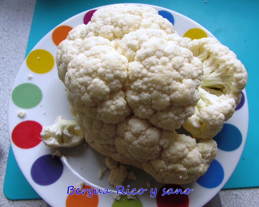 La preparación:1. Venga, que esto lo tenemos en un plisplás. Ponemos la coliflor a hervir hasta que esté tierna; unos 10-15 minutos desde que rompa a hervir. Yo siempre la hiervo con media pastilla de caldo para darle sabor y neutralizar el olor.