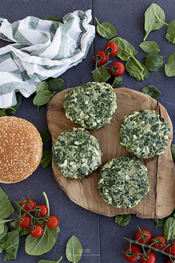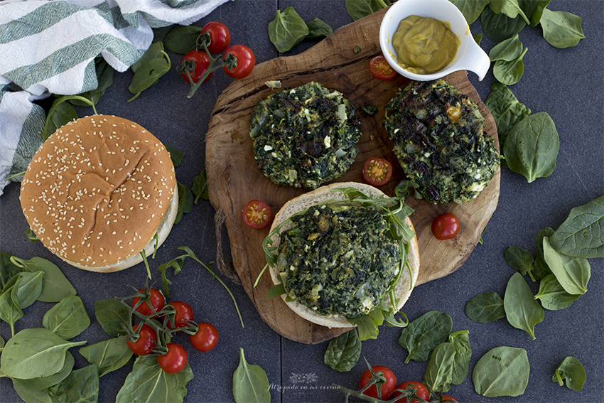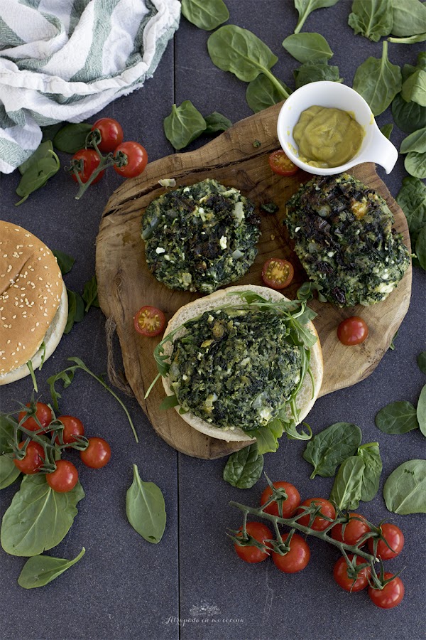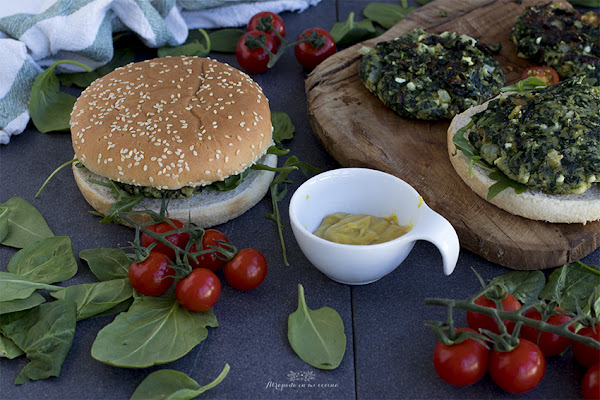 Las espinacas están de plena temporada, y para aprovecharlas con recetas nuevas he preparado estas riquísimas y sanas hamburguesas. No tienen mucho que ver con las que comercializan, en estas se puede apreciar el sabor de todos sus ingredientes. La hemos acompañado de unas hojas de rúcula y de unas rodajas de tomates cherry, junto con un poco de mostaza, y el conjunto es bien rico, podéis prescindir del pan si queréis reducir calorías, o hacerlo vosotros mismos con esta receta, o simplemente comprarlo, como he hecho yo en esta ocasión por falta de tiempo para prepararlo.