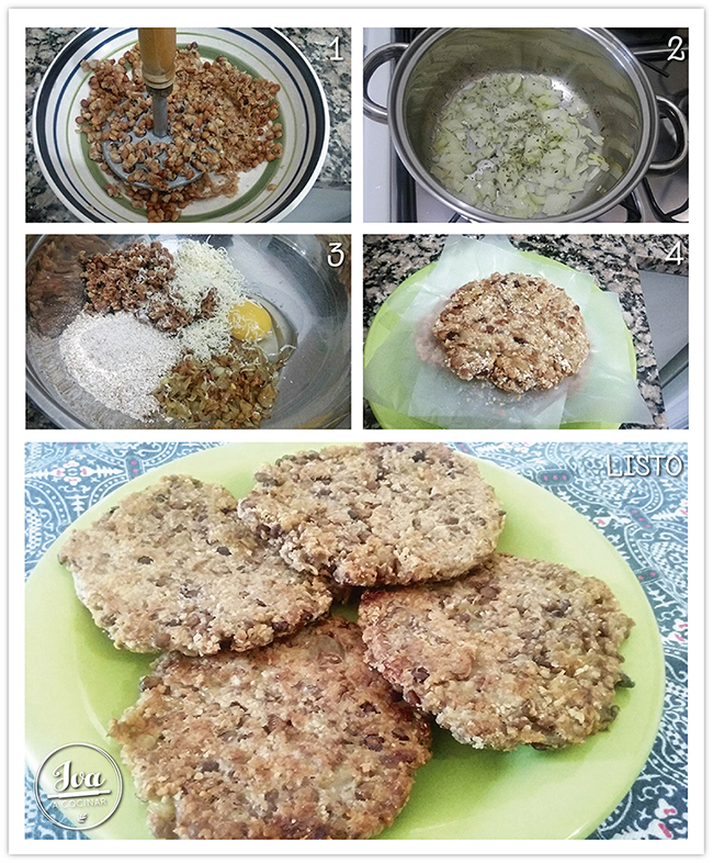 Rehogamos la cebolla y se la incorporamos a la lenteja, le sumamos el huevo, el queso rallado y la avena. Salpimentamos y mezclamos.