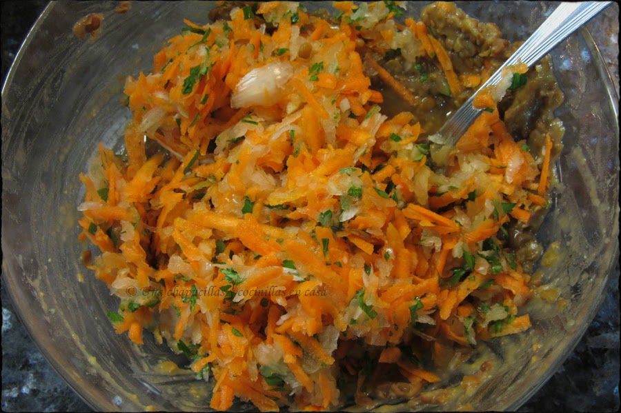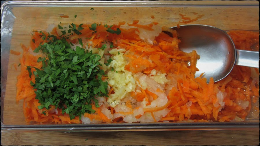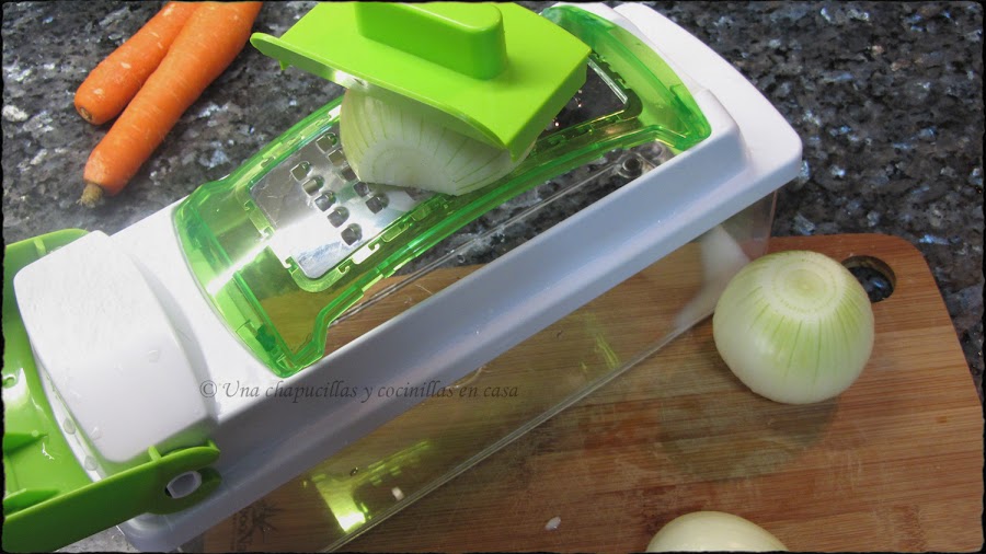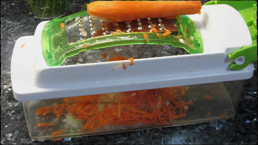 Mientras rallar con una mandolina las cebollas y las zanahorias. Yo las rallo porque van crudas, si no os gusta la zanahoria ni la cebolla cruda, cortarlas en daditos pequeños y rehogarlas un poco, para mi gusto pierde el encanto del chasquear de la zanahoria y su sabor.