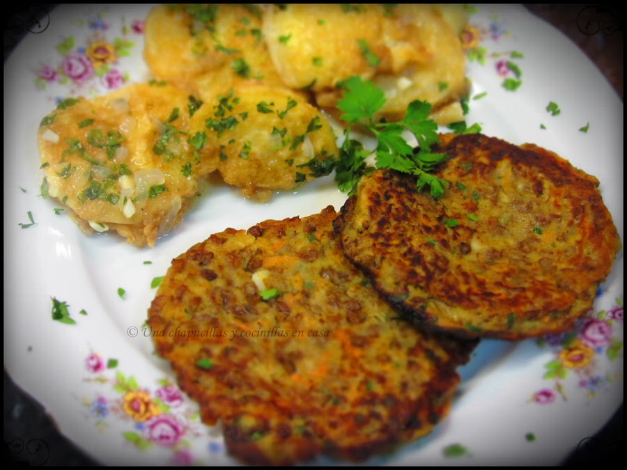Hamburguesas de lentejas acompañadas de patatas a la importancia