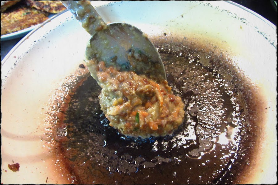 Separar la mitad de las lentejas y triturarlas con ayuda de un tenedor. Si preferís se pueden triturar todas.