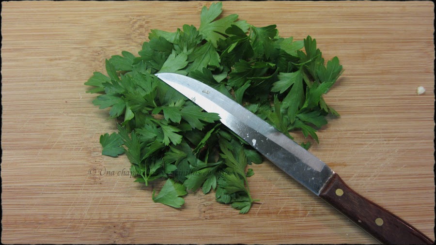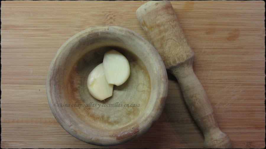 Machacar en un mortero los dos dientes de ajo y picar finamente el perejil.