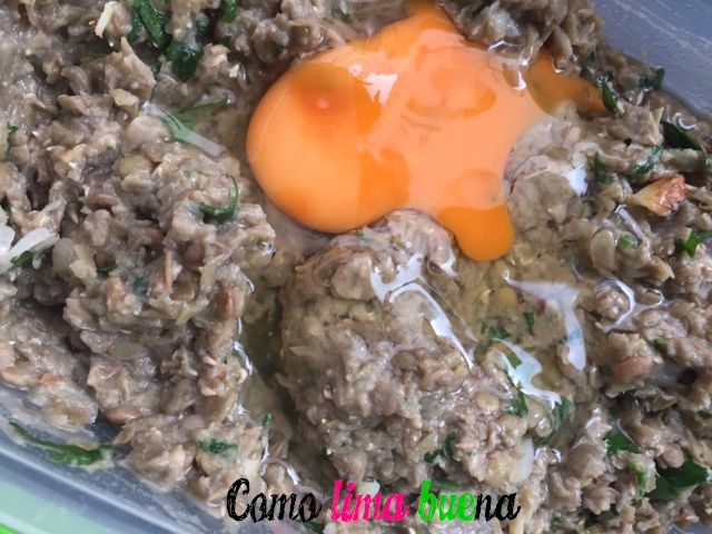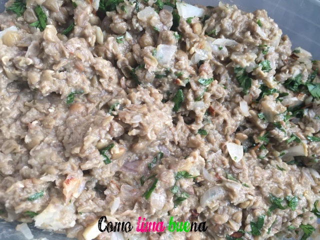 Procesar las lentejas y convertirlas en puré. Condimentar ese puré con sal y pimienta. Agregarle la cebolla, el ajo y el perejil.