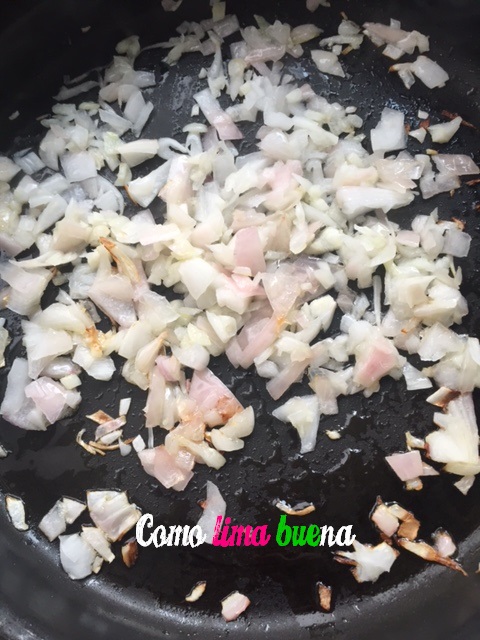 Picar la media cebolla y el ajo, y dorar en una sartén.