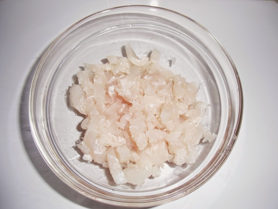 Limpiamos de piel y espinas, lavamos y secamos la merluza, la picamos e introducimos en un bol.