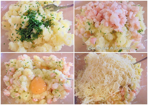 3. Añadimos cebollino picado, las gambas cocidas troceadas, los huevos enteros y el queso rallado. Removemos según vayamos añadiendo los ingredientes.