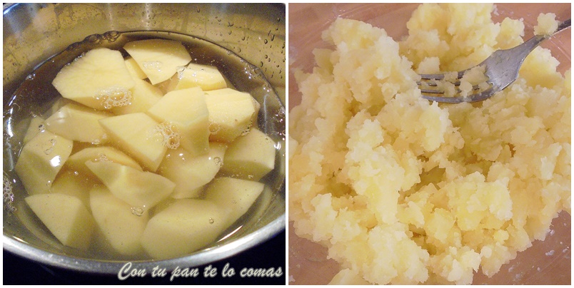 2. Escurrimos las patatas y todavía en caliente las chafamos con un tenedor. Ahora las dejamos enfriar.