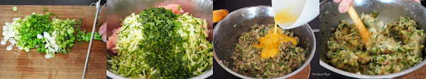 Picar las cebolletas, los ajos, la menta y el cilantro. Escurrir bien el calabacín.
