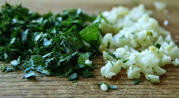 Troceamos el ajo y el perejil con el cuchillo y ponemos en un bol. Si troceamos bastante cantidad, se puede guardar en aceite vegetal en la nevera para otros usos. Ojo no usar aceite de oliva para conservar alimentos en el frigorífico porque se congela.