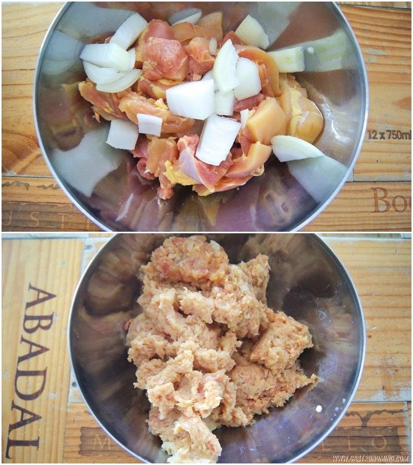 1. Lo primero que hacemos es poner el pan en remojo en la leche.2. Mientras, en un triturador de carne o procesador de alimentos, trituramos la carne de pollo junto con los trozos de cebolla. Colocamos la mezcla en un bol y reservamos.