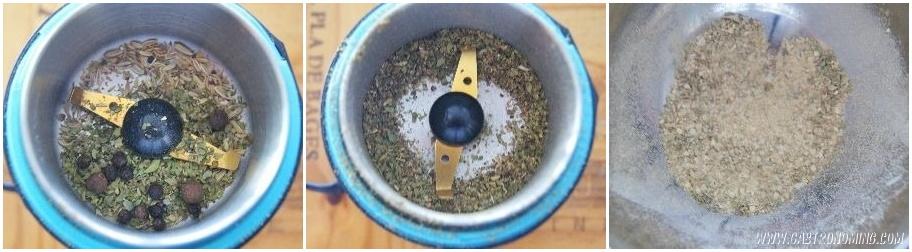 3. A su vez, en un molinillo de especias o licuadora, trituramos el oréganos, las semillas de hinojo, los granos de pimienta de Jamaica y pimienta negra.