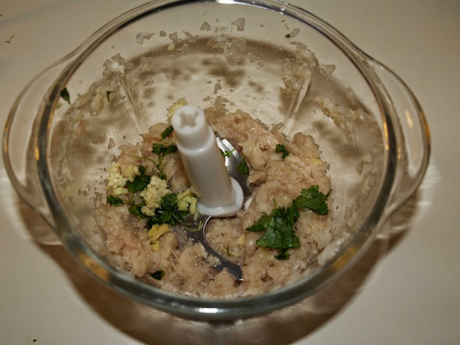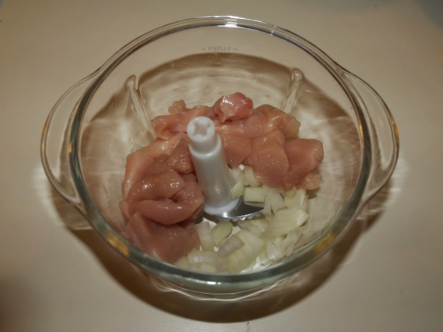 - Empezamos limpiando y cortando la pechuga en trozos. Hacemos igual con la cebolla y las picamos juntas con el robot de cocina.