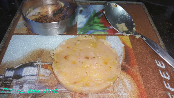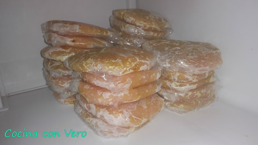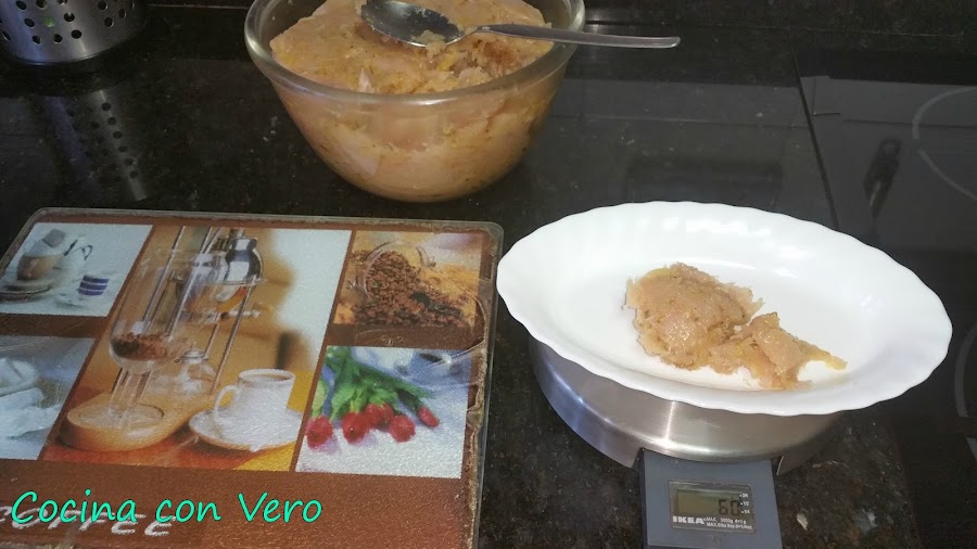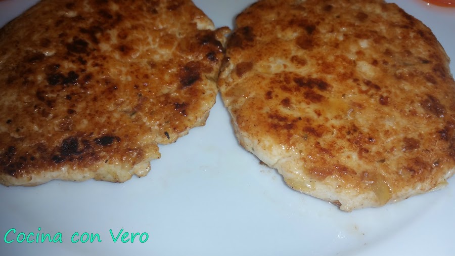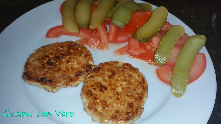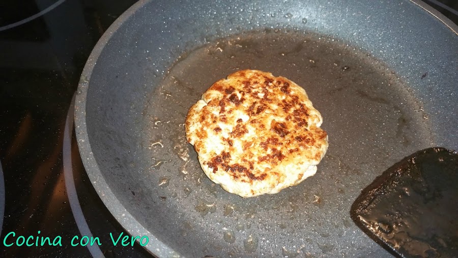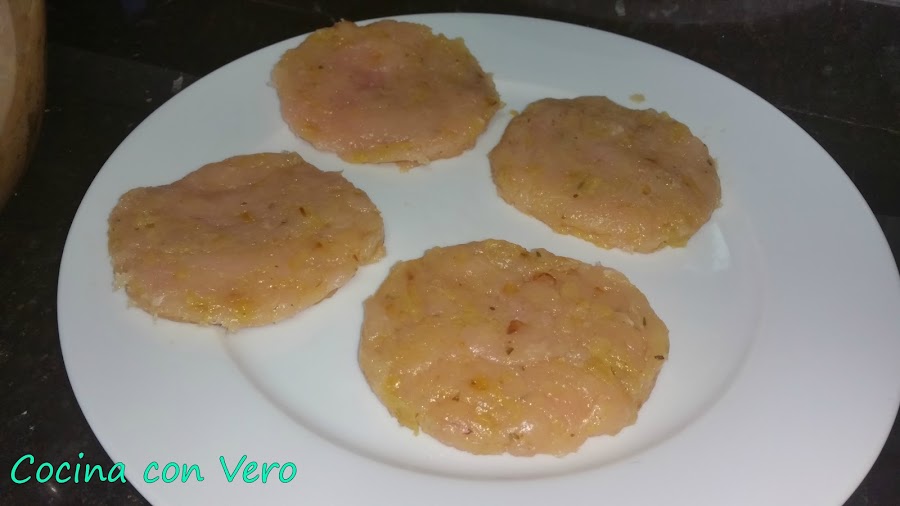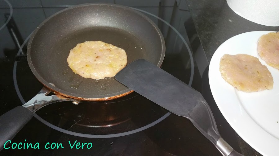 2/ Una vez sofrito lo apartamos y lo dejamos enfriar. Echamos a un bol los trozos ya picados de las pechugas de pollo. A continuación, agregamos encima el sofrito que hicimos, lo mezclamos bien y se van formando las hamburguesas de 60 gr. cada una pesándolo en la pesa de alimentos. Las que se vayan a consumir las pasamos por una sartén previamente con un poco de aceite para hacerlas a la plancha por ambas caras. Si se quieren se congelan en el congelador las sobrantes tapadas una a una con film transparente para otro día.