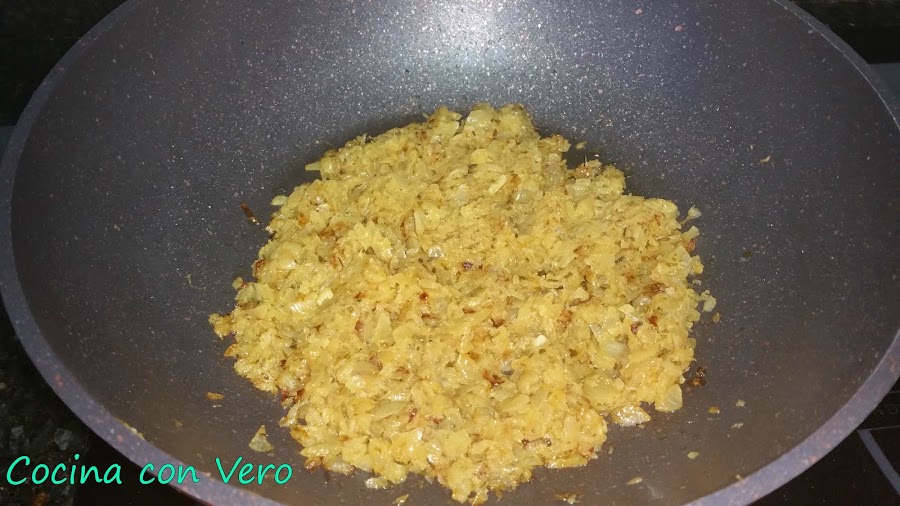 1/ En un wok ponemos las cebollas ya picadas con aceite de manera que cubra el fondo junto con el ajo picado, si vemos que queda seco se le añade un poco más de aceite, le incorporamos por encima la sal y lo dejamos sofreír, revolviéndolo de vez en cuando con la cuchara de madera. Le agregamos la cúrcuma, el perejil, el orégano, el tomillo, la pimienta negra, el comino y el curry. Revolvemos hasta que esté bien sofrita la cebolla.