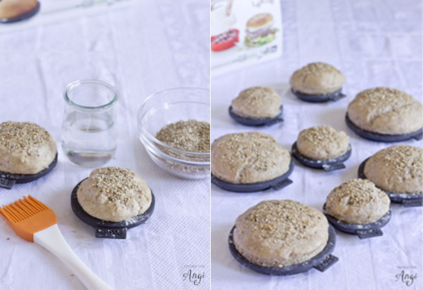 Aplastamos suavemente las bolas achatándolas, las pincelamos con agua y espolvoreamos con semillas de sésamo.Tapamos y dejamos reposar durante otra ½ hora.