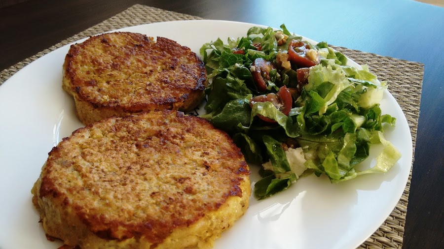 Poner al fuego medio una sartén antiadherente con un chorro de aceite de oliva y cuando esté caliente vamos poniendo a cucharadas la masa en forma de hamburguesas (me ayudé de un emplatador para darle forma redonda pero si no tenéis aunque os quede más irregular no tendréis problema para conseguir una forma redondita). Puse más o menos tres cucharadas por hamburguesa. Cuando veamos que ya se está tostando damos la vuelta y hacemos por el otro lado. No hay que hacerlas muy gruesas ya que sino nos pueden quedar crudas por dentro.