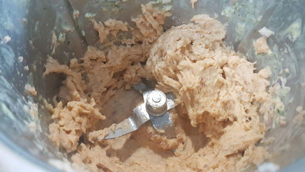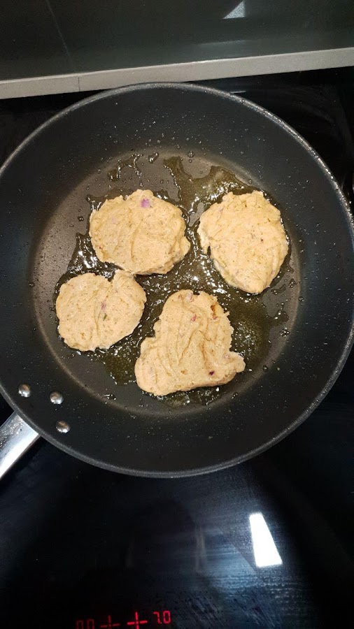 Sacamos la mezcla y hacemos en una sartén. Yo cojo la mezcla con una cuchara grande y luego las aplasto en la misma sartén.