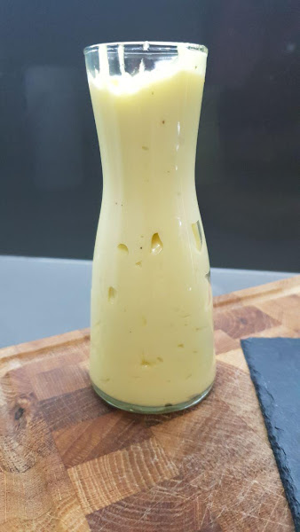 Para la mahonesa batimos el huevo con la lima y la sal y vamos incorporando a poquitos el aceite y al final del todo añadimos un chorrito de aceite de trufa, al gusto. Reservamos en la nevera.
