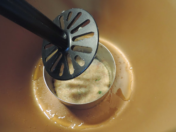 Ponemos dentro un aro de emplatar y le echamos 3 cucharadas de la mezcla y lo emparejamos.