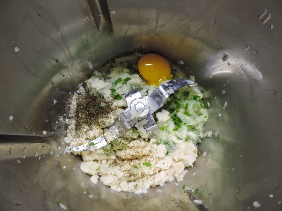 Añadimos al vaso donde tenemos la cebolla, perejil y ajos picados, el pan mojado, eneldo, pimienta y huevo.