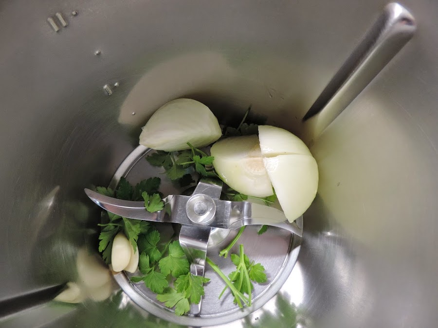 Poner la cebolla, los ajos y el perejil en el vaso del thermomix.