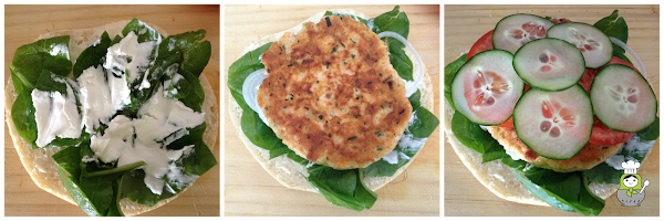 Mientras se hacen preparamos el pan, en el que untaremos el queso de cabra (nosotras hemos añadido un poco también sobre las espinacas porque somos fans incondicionales de este queso), después colocaremos las hojas de espinaca lavadas y secas, encima la cebolleta, sobre ella la hamburguesa y, por último el tomate y el pepino cortados en rodajas finas. Cerramos con el otro trozo de pan y listo.