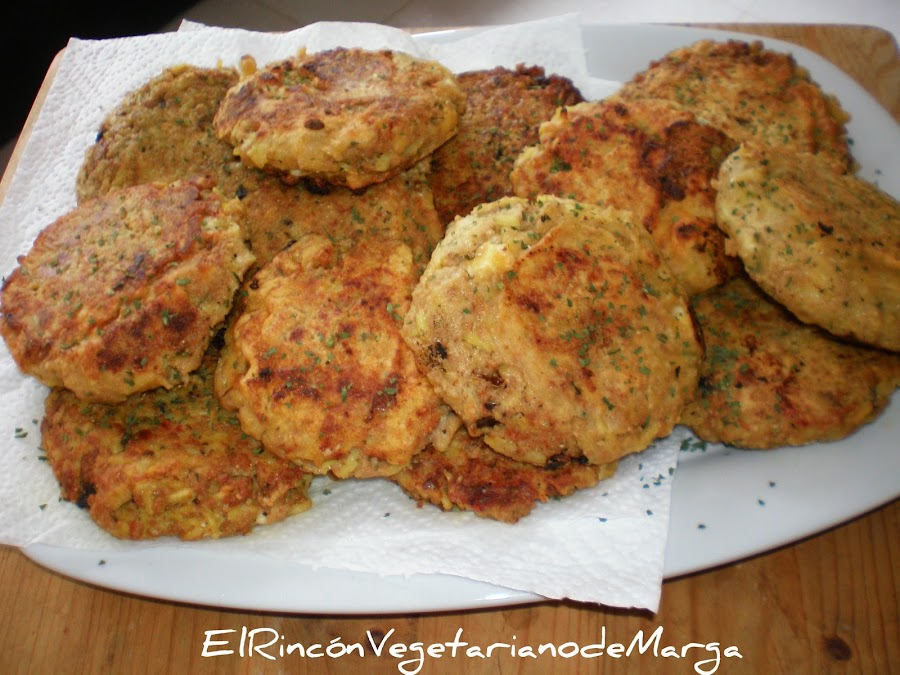 Mezclamos tres cucharadas de harina de garbanzo con un poco de agua y pasamos las hamburguesas por esta masa. Las freímos en abundante aceite caliente.