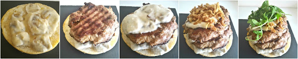 Nos hemos decidido por unas hamburguesas de ternera acompañadas con una salsa a base de queso azul alemán, cebolla frita crujiente y rúcula. La combinación ha resultado excelente!