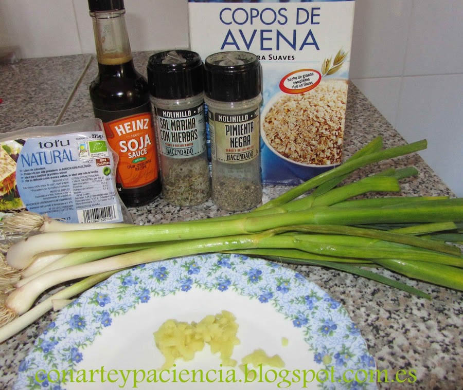 Troceamos y picamos el tofu. En un bol incorporamos el tofu junto con la soja, ajos tiernos, jengibre y avena. Yo he utilizado avena pues mi compañera es intolerante al gluten pero se puede sustituir por harina. Incorporáis las especias para dar gusto y color, unas cinco cucharadas o a vuestro gusto y amasáis.