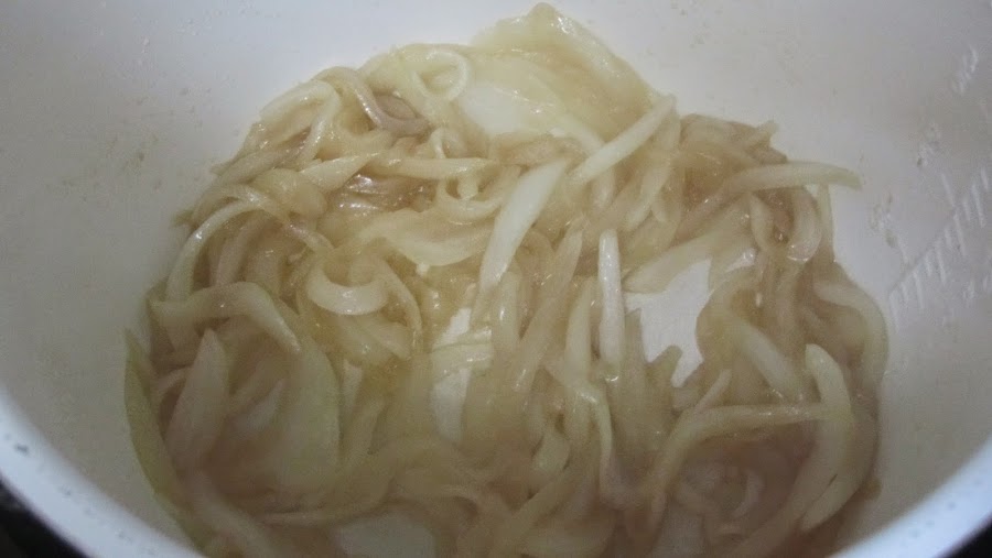 *Hago antes un par de cebollas en láminas en menú freir y 1 cda , sopera de azúcar moreno y un chorrito de aceite, todo destapado hasta que coge color la cebolla.