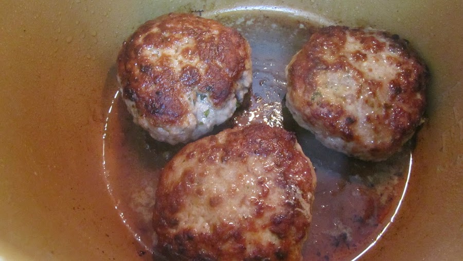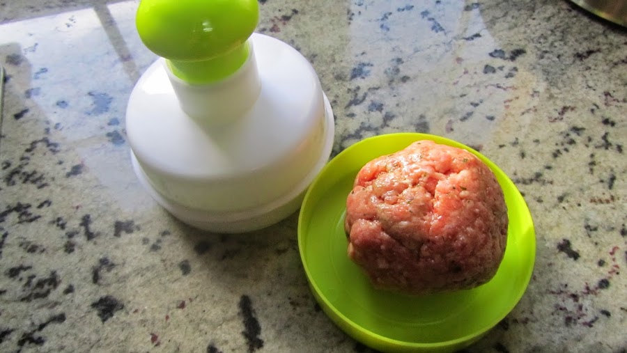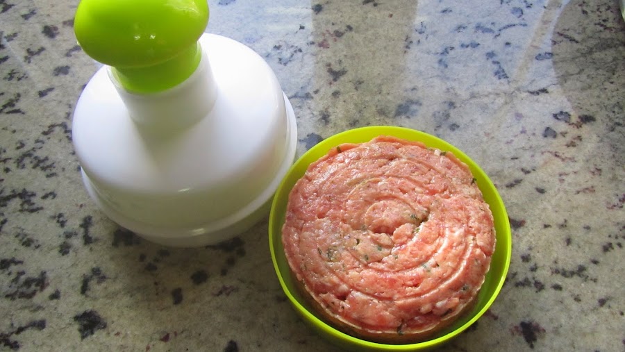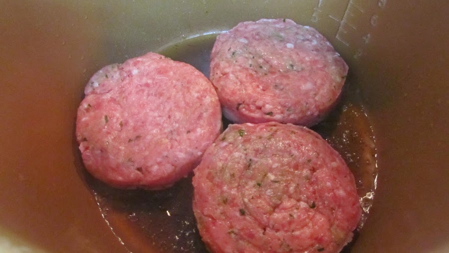 1- Calentar como 2 cdas, soperas de aceite en la cubeta en menú freír. Mientras, ir adobando la carne con las especias, y chorrito de soja y vino blanco. Dividir en 3 bolas iguales, engrasando las manos con un poco de aceite de oliva y formar las hamburguesas. (Ese aparato va de cine, no se trabaja ni un pizco, jeje).