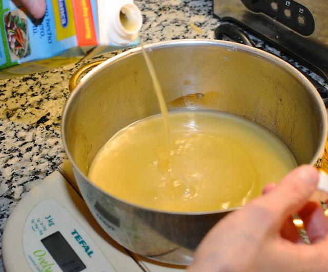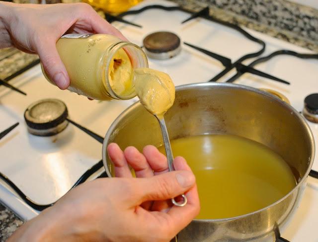 Calentamos el caldo de verduras junto con el vinagre y la mostaza de Dijon.